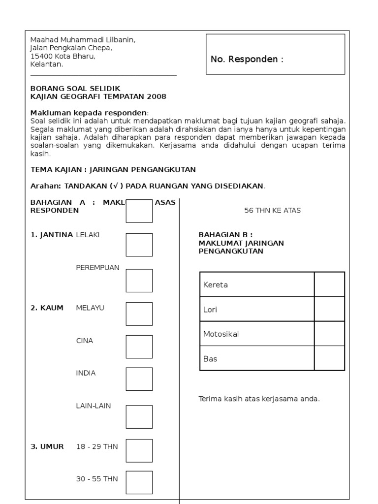 Borang kaji atau soal selidik ini perlu dibuat dalam perlaksanaan dan disertakan dalam pelaporan tugasan wajib bagi ujian pelbagai instrumen (geografi) pentaksiran tingkatan 3 (pt3) kajian lapangan atau lebih dikenali sebagai kerja kursus, agar menjelaskan lagi hasil dapatan dan maklumat yang. Muat naik * sila lampirkan soalan soal selidik. 10 susunan soalan dalam borang soal selidik 2. Jantina lelaki ( ) perempuan ( ) 3. Kerjasama anda melengkapkan borang soal selidik ini didahulukan dengan ucapan ribuan terima kasih.
