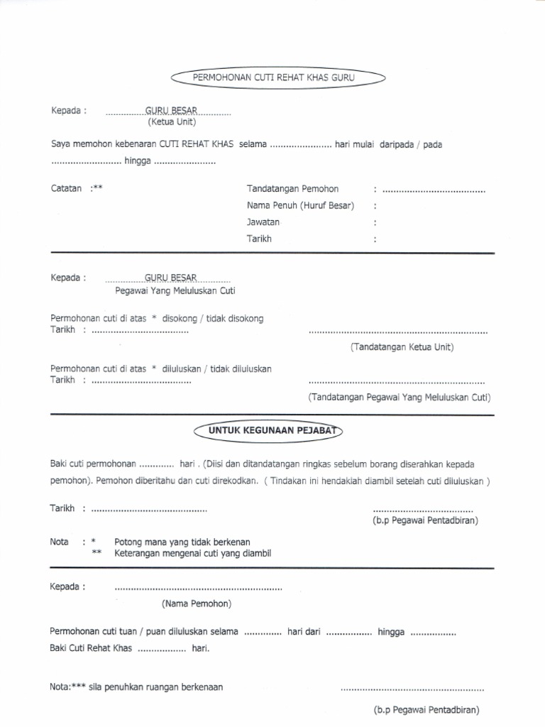 MOshims: Borang Cuti Rehat Khas Guru Terkini from reader015.docslide.net Pujuk diri untuk kembali kuat. Mulai 1 januari 2009, pegawai boleh mengumpul cuti rehat dan cuti rehat khas untuk menambah sehingga maksimum 150 hari. Cuti rehat khas (crk) adalah cuti khusus yang diperuntukkan kepada pegawai perkhidmatan pendidikan. Tidak salah lagi saat kuperhatikan betul foto dirinya yg sedang berdiri dengan senyum khas di wajahnya. Savesave cuti rehat eiotso 2017 for later. Diberi kepada ppp yang bertugas sebagai guru serta mengajar di sekolah /matrikulasi/institusi pendidikan tidak termasuk guru besar atau pengetua dan ppp yang berkhidmat di kementerian , jpn dan ppd. Perkara mengenai cuti rehat 10 hari untuk pegawai perkhidmatan pendidikan ini atau guru dinyatakan dalam pekeliling perkhidmatan awam bil 8 tahun 2017. Cuti rehat khas selama 10 hari setahun diberikan khusus kepada guru dan pegawai perkhidmatan pendidiiakn kerana selama ini mereka dinafikan kemudahan sedemikian.