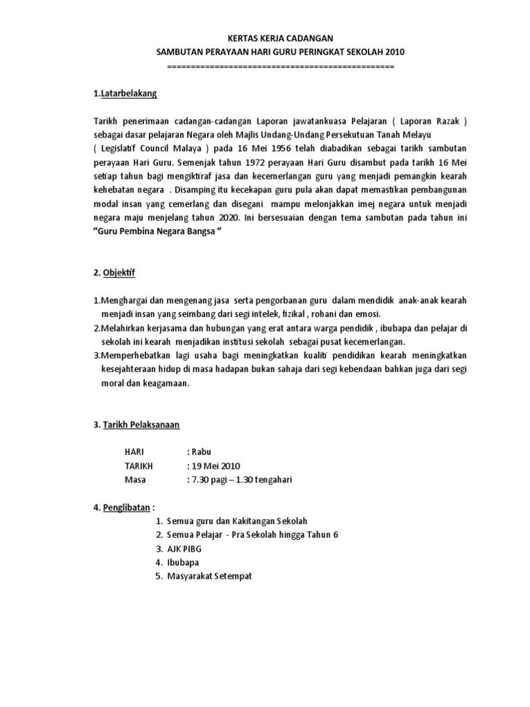 Kertas Kerja Hari Guru Autosaved from image.slidesharecdn.com (nama program) ( bahasa melayu sahaja ). Kertas kerja ini dikemukakan bertujuan seperti berikut: 25 november merupakan tanggal untuk memperingati hari guru. Menitikberatkan peranan guru dalam pembinaan kebangsaan (termasuk perpaduan dan integrasi), pembangunan negara dan perkhidmatan kepada masyarakat. Kejohanan sukan tahunan & mini sukan olimpik 2017. Unit pengeluaran / jam operasi nyatakan hasil operasi dalam unit produk pengeluaran mengikut kesesuaian projek. Home hari guru 【hari guru】koleksi kertas kerja hari guru. Tajuk hendaklah jelas dan menggambarkan matlamat/objektif program/projek.